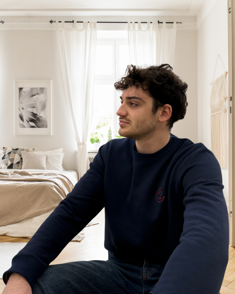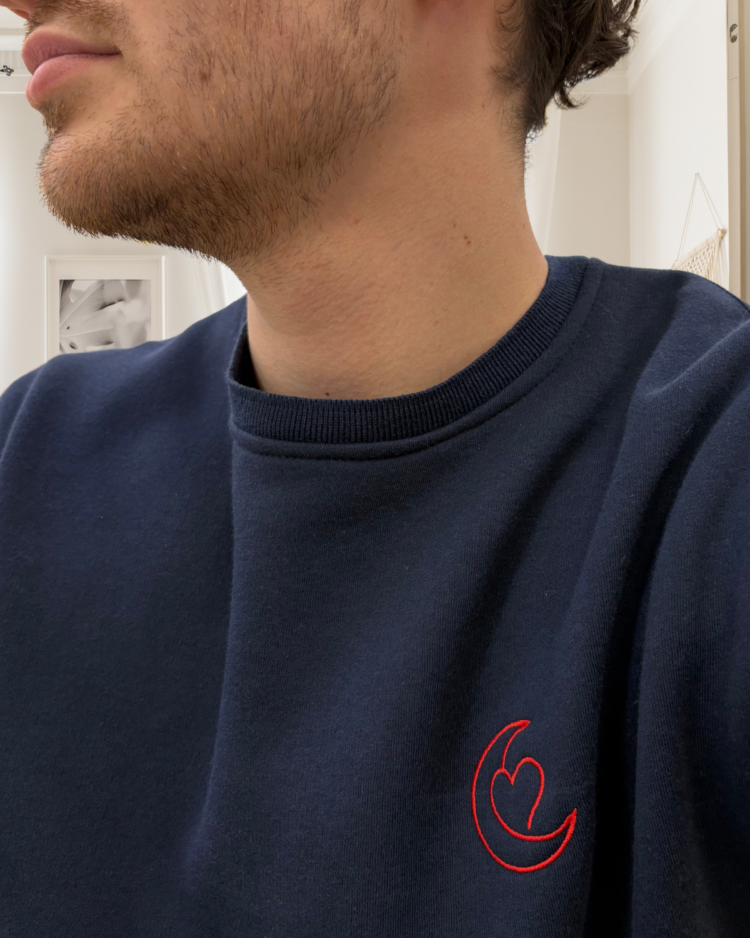 Sweat-shirt bleu nuit avec broderie rouge.